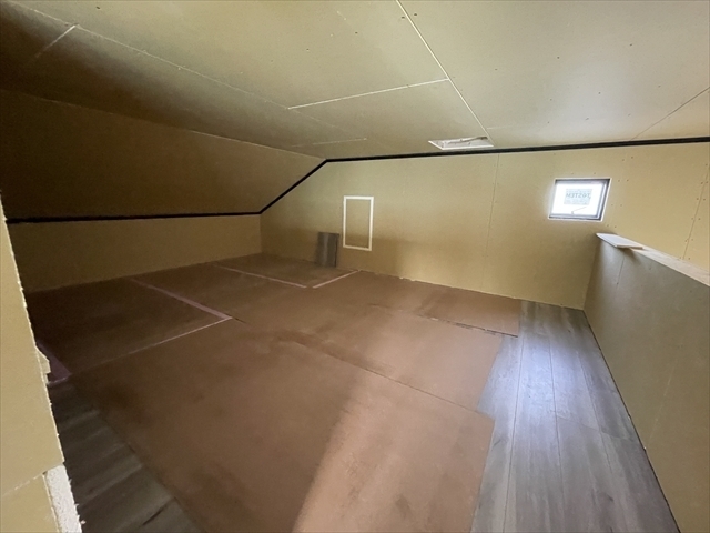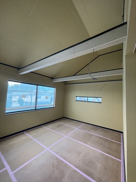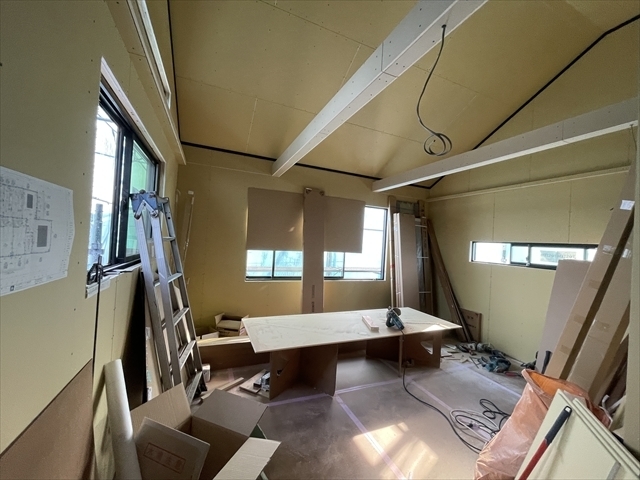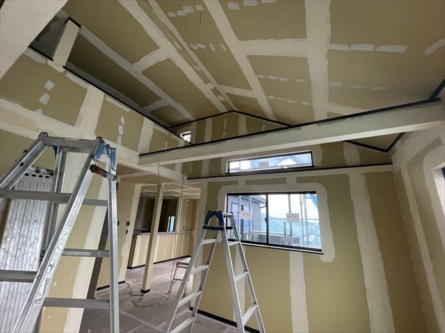 石膏ボードを張り始めました。リビングの天井は吹抜けになっており、その上にはロフトが見えます。