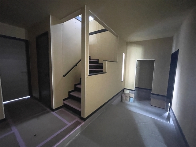 内装仕上工事が始まりました。下地処理を行い、壁紙を張り始めています。外部は足場が外れました。