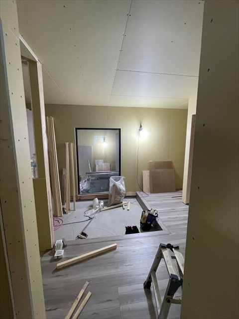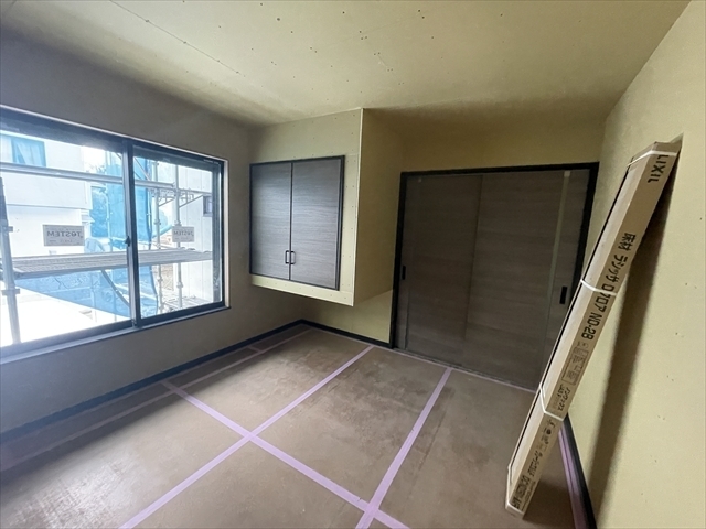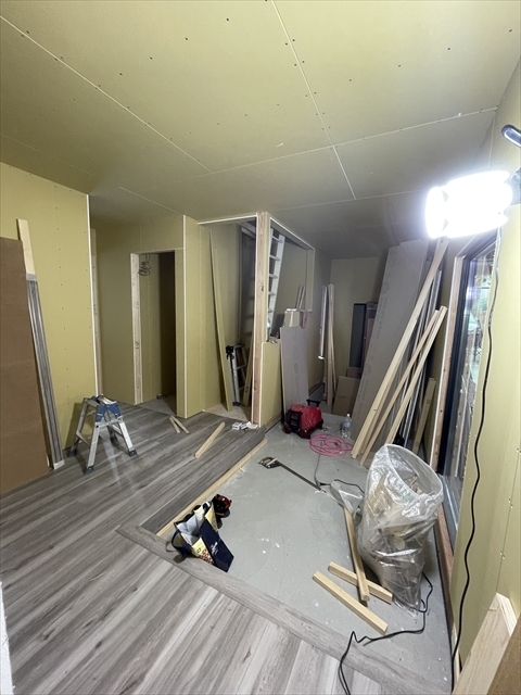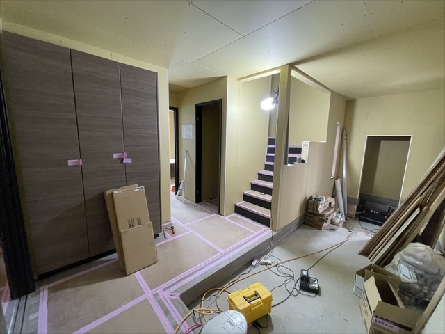 石膏ボードが張り終わりました。造作材の取り付けを行っています。