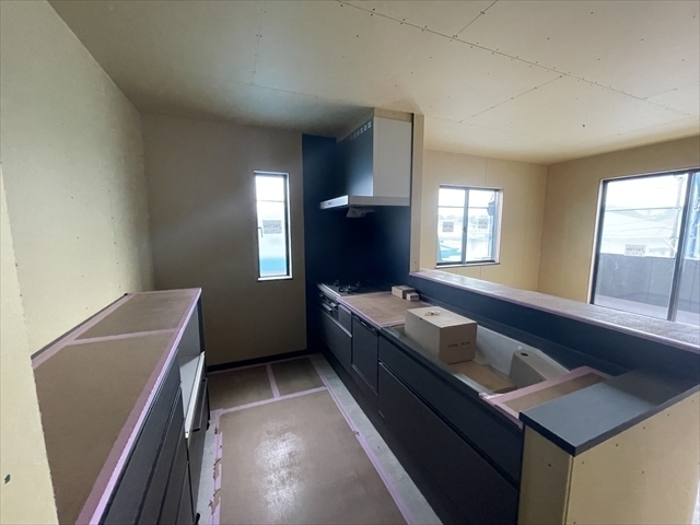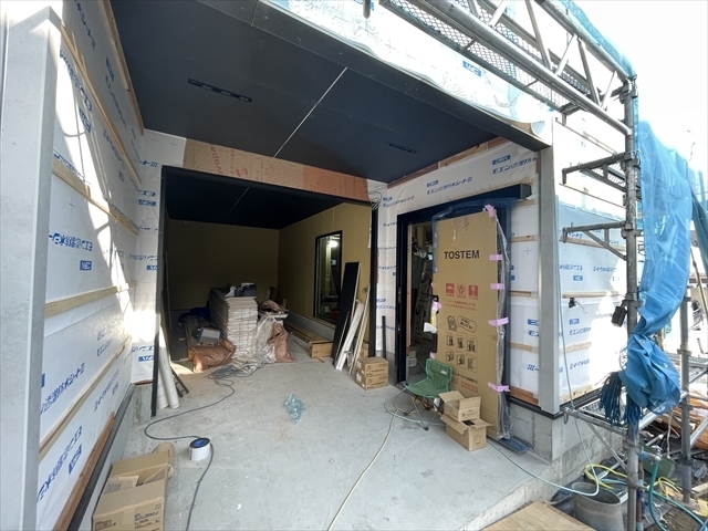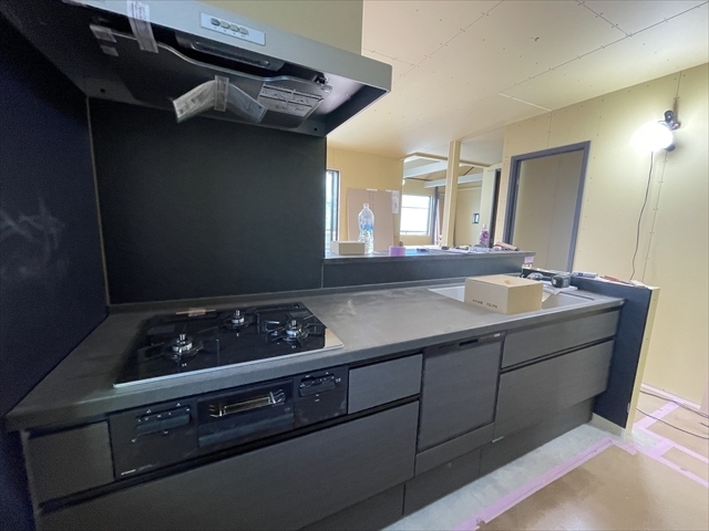 玄関収納とキッチンが設置されました。外部のサイディング張りは、もう少し終了です。