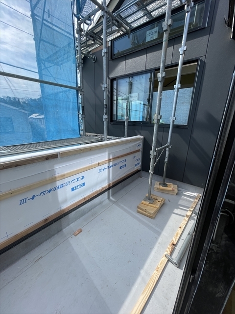 木工事が終了しました。サッシの取り付けを行っています。外部は屋根工事が終了しています。