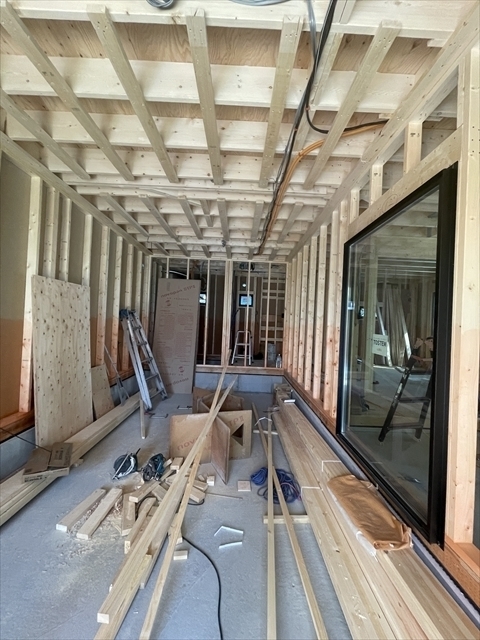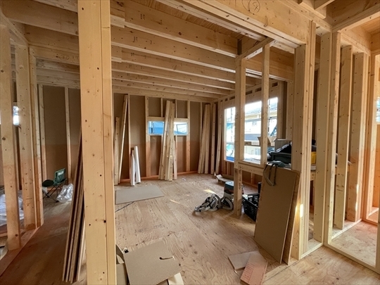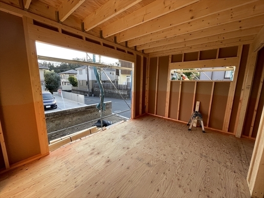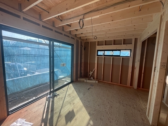 木工事が終了しました。サッシの取り付けを行っています。外部は屋根工事が終了しています。