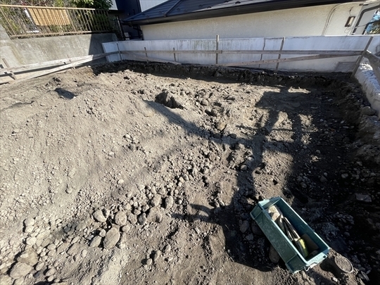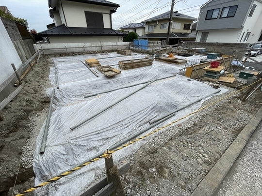 砕石を敷いて転圧し、防湿シートを敷設しています。