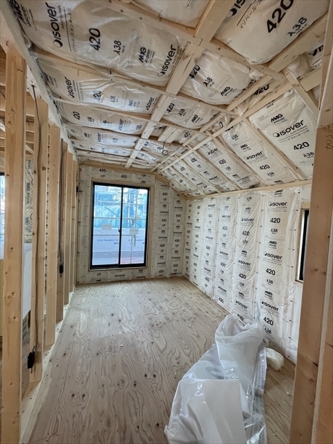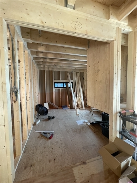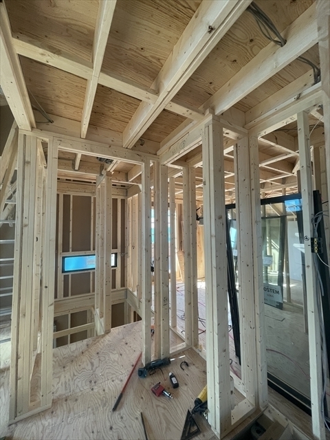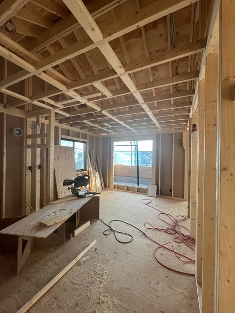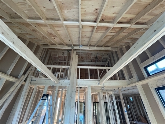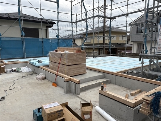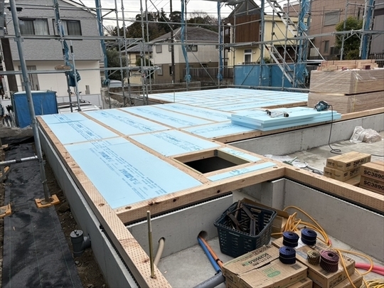 木工事を開始しました。1階の床を組み、断熱材を設置しました。