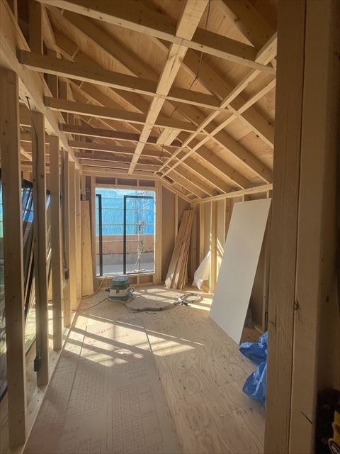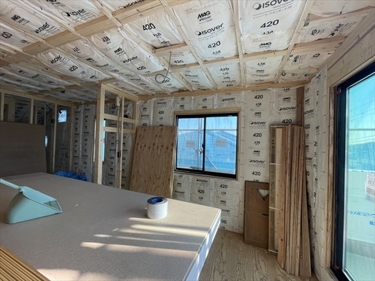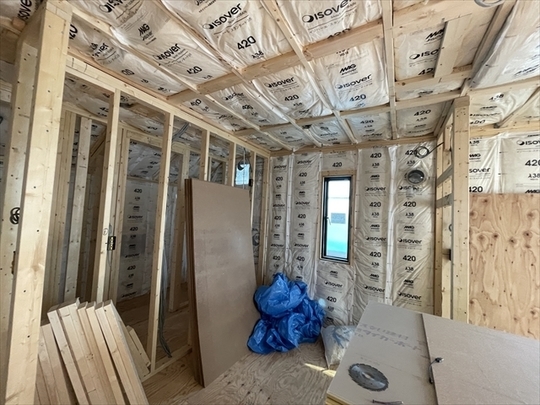 2階から断熱材を充填しています。外部は透湿防水シートが張られています。