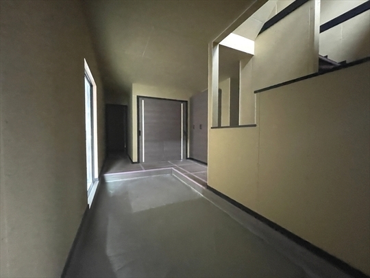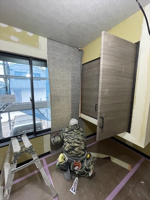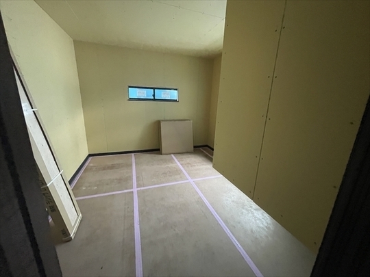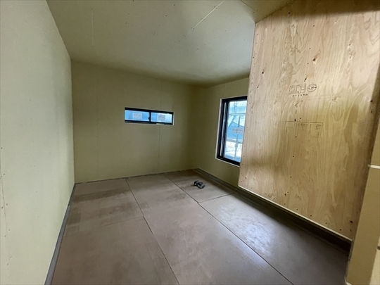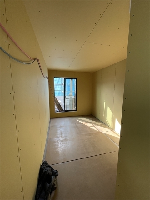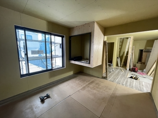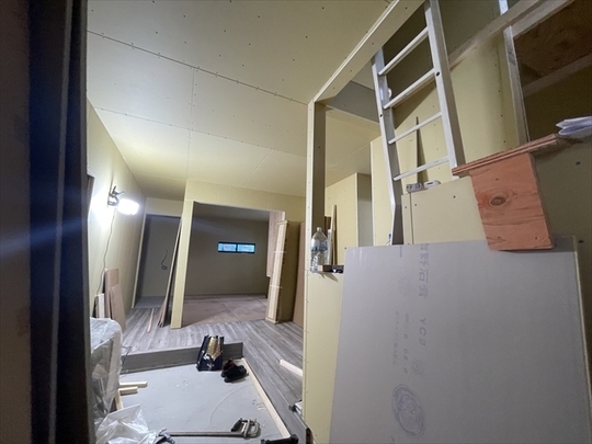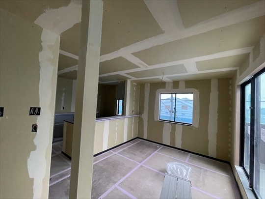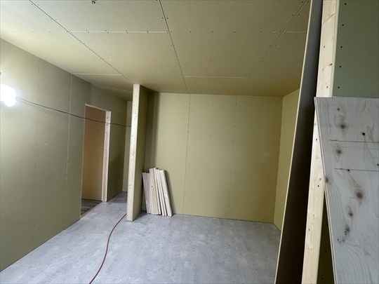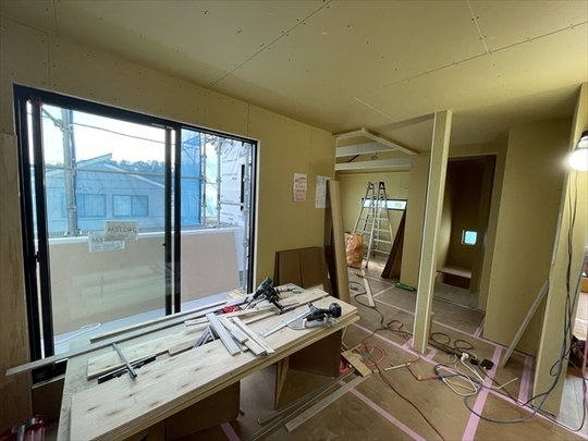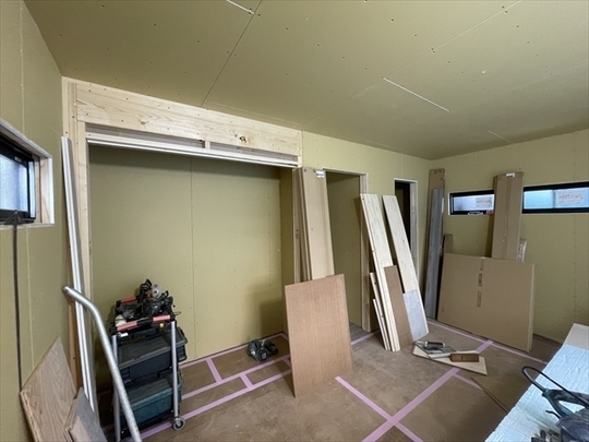 石膏ボードが張り終わりました。造作材の取り付けを行っています。