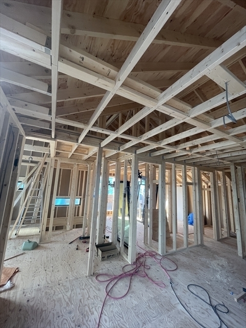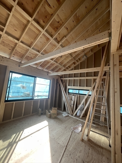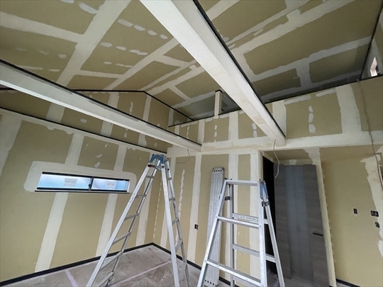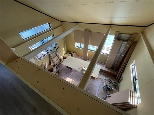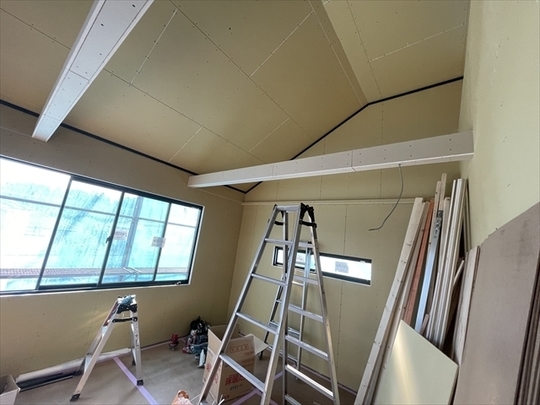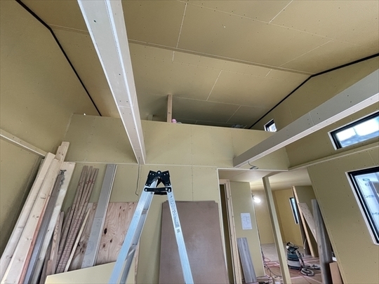石膏ボードを張り始めました。リビングの天井は吹抜けになっており、その上にはロフトが見えます。