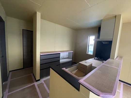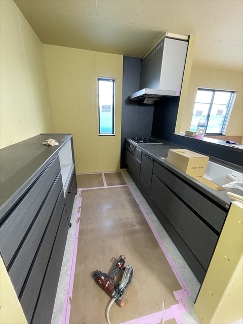 玄関収納とキッチンが設置されました。外部のサイディング張りは、もう少し終了です。