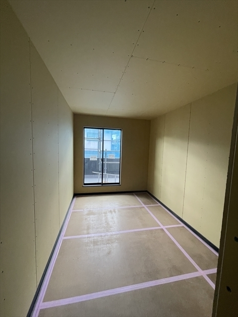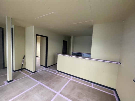 内装仕上工事が始まりました。下地処理を行い、壁紙を張り始めています。外部は足場が外れました。