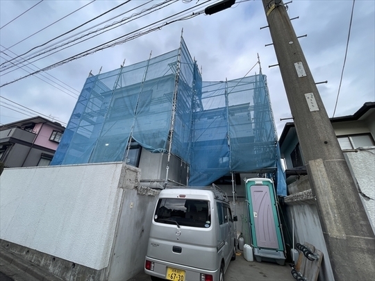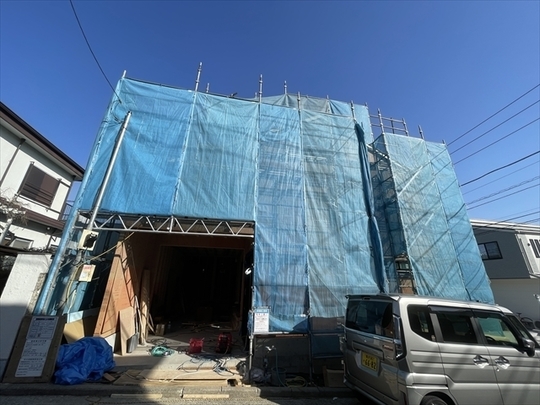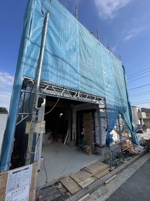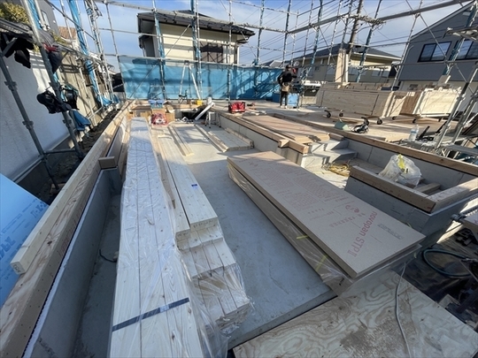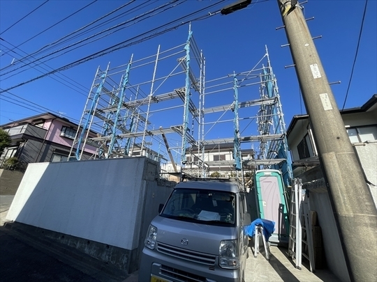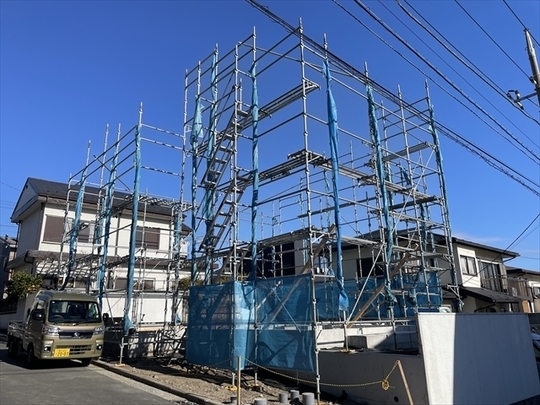 本日より新年の工事が始まりました。足場を設置し終わり、木材が搬入されています。
