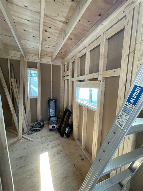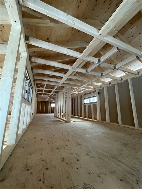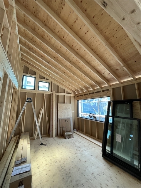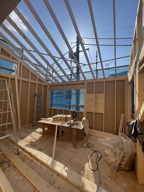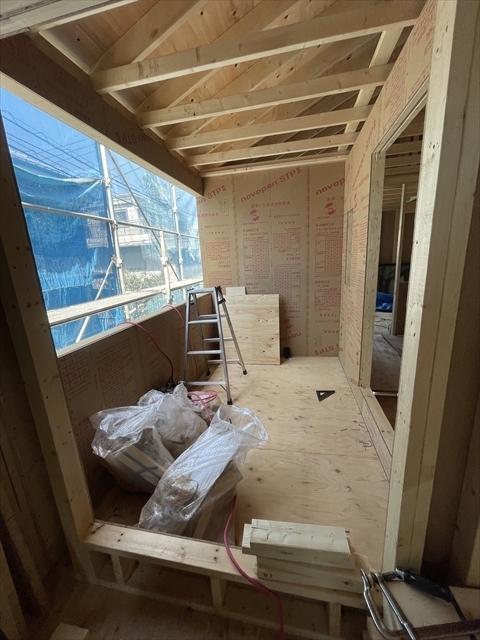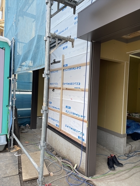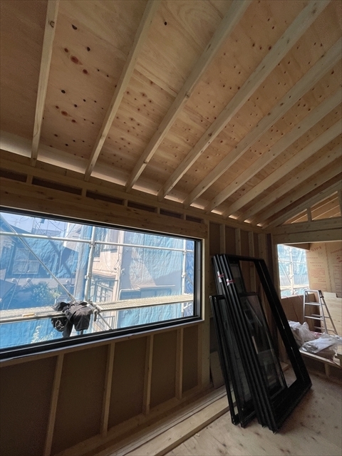 野地板を張り、木工事が終了しました。サッシの取付を行っています。