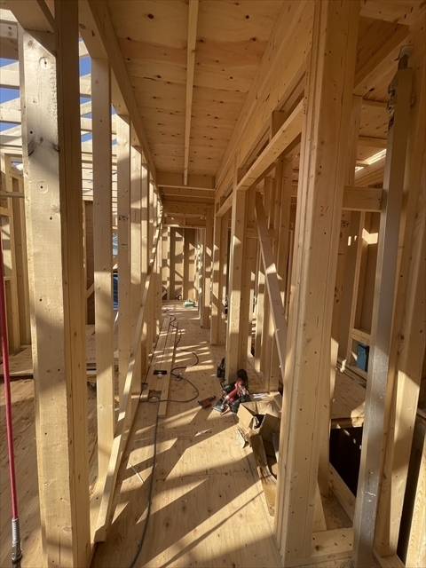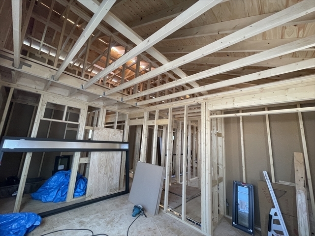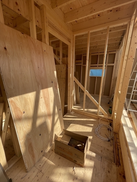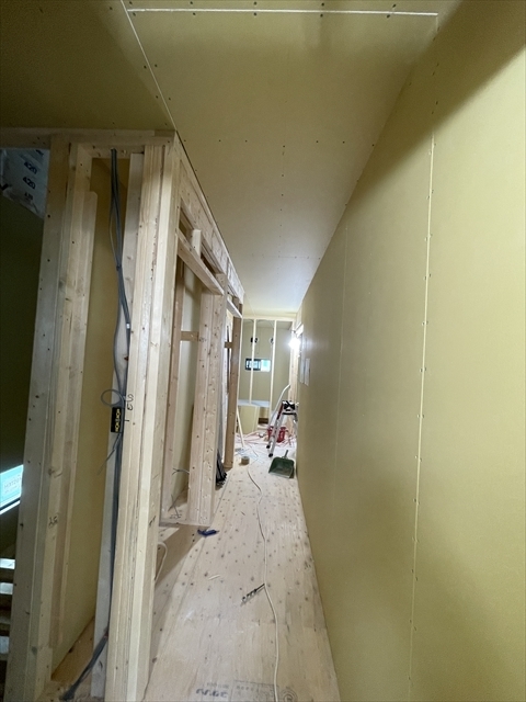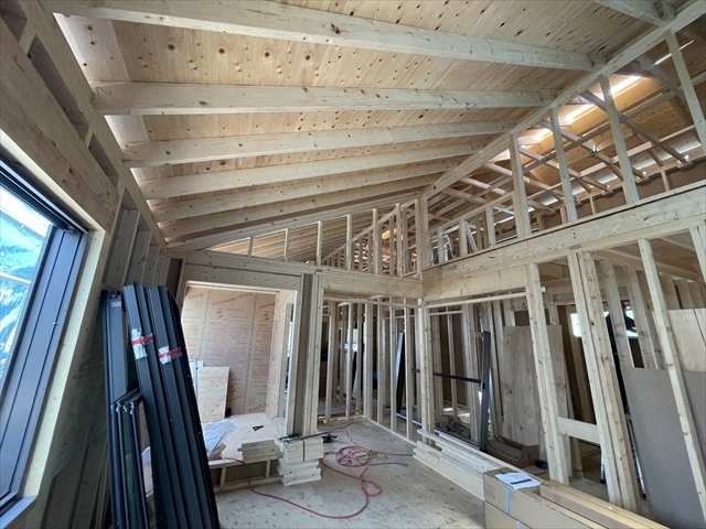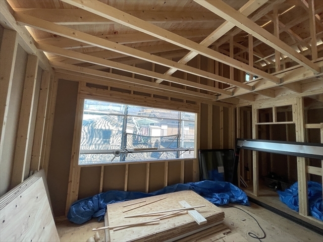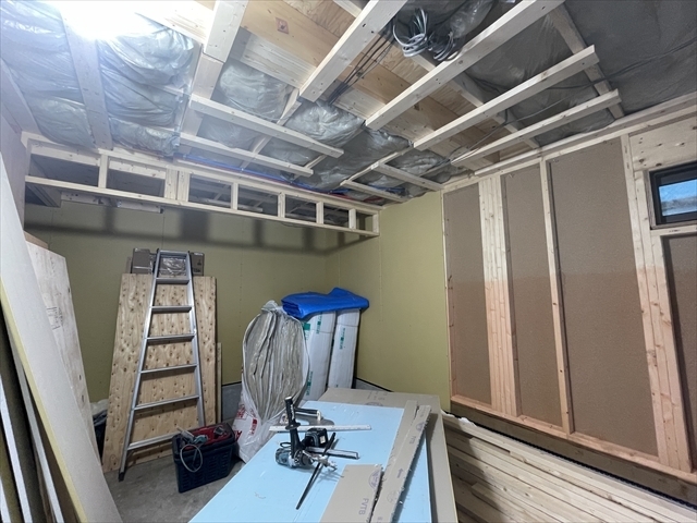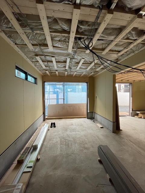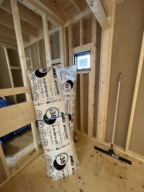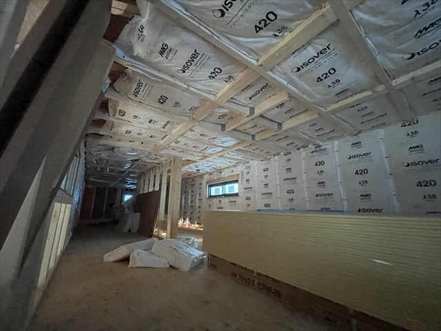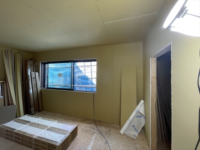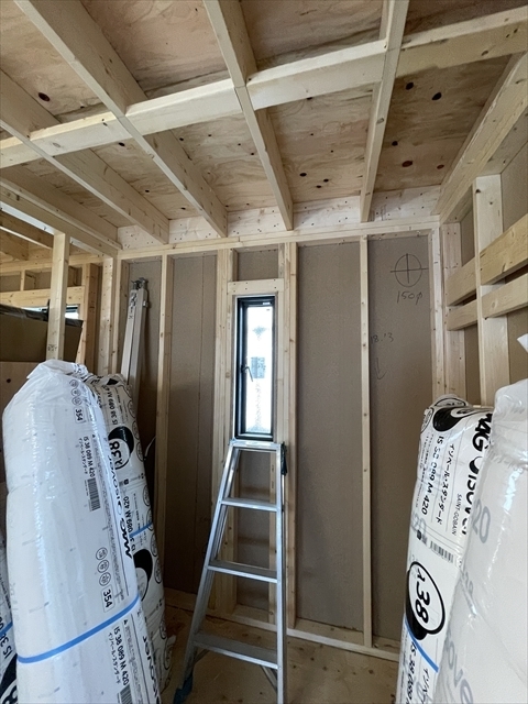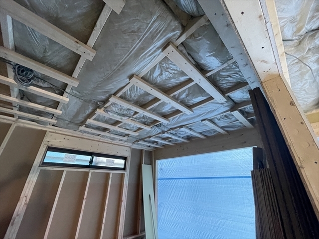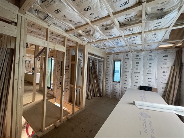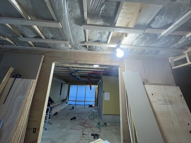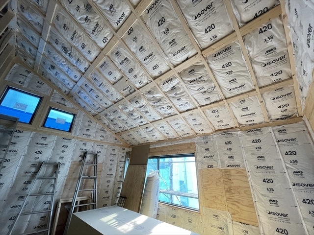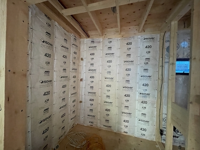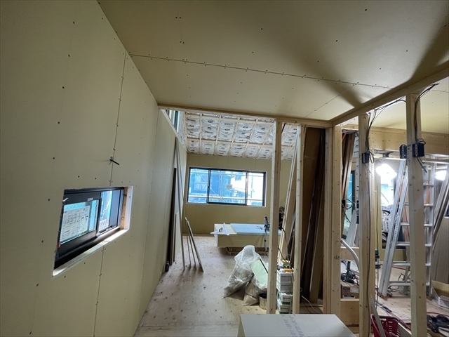 断熱材の充填が終了し、石膏ボードを張り始めました。