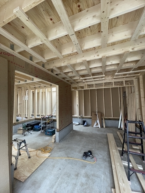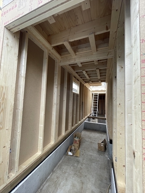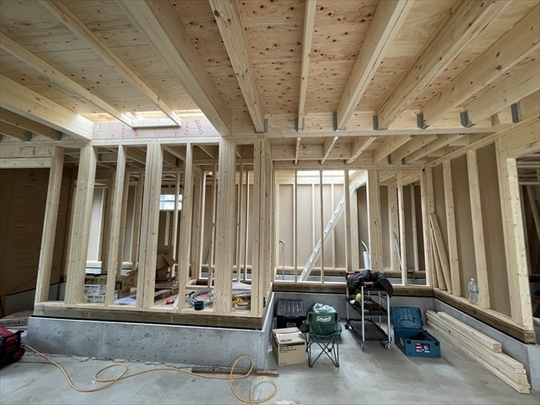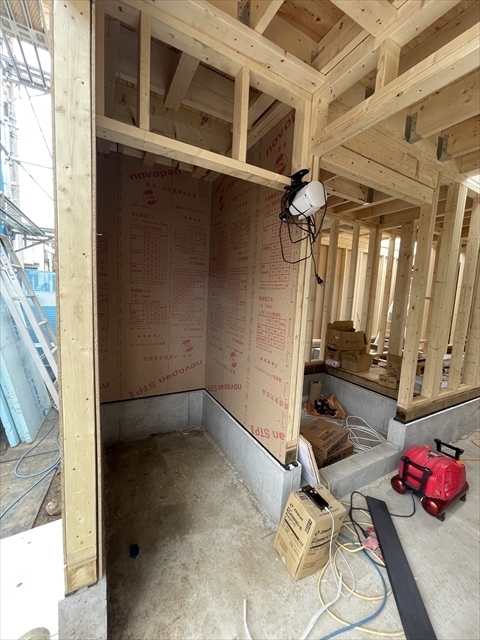 木工事を開始しました。基礎パッキンを設置し、土台敷きを行っています。