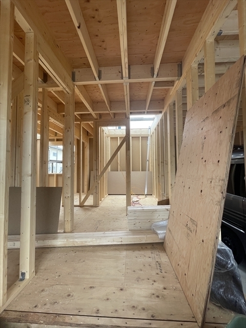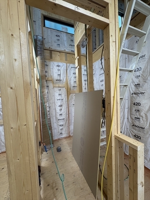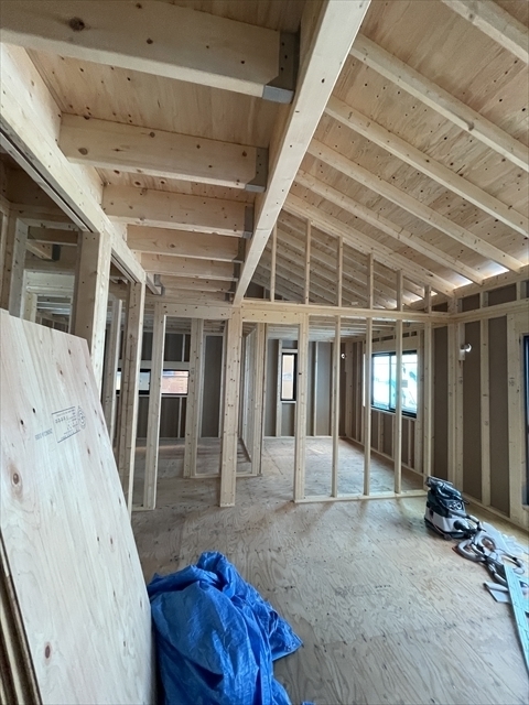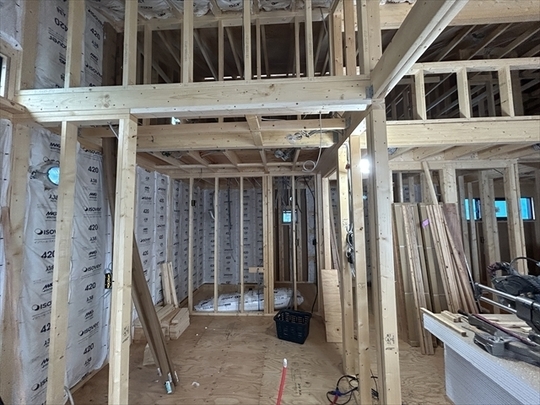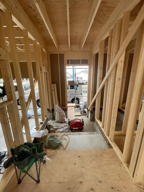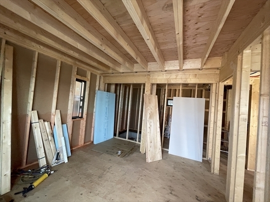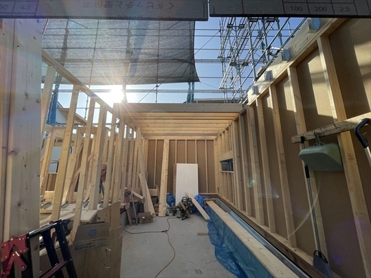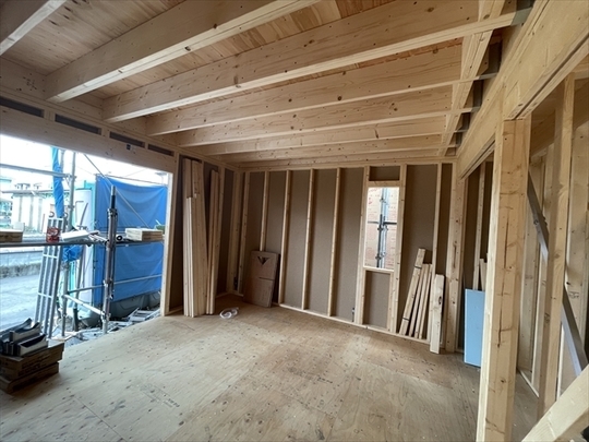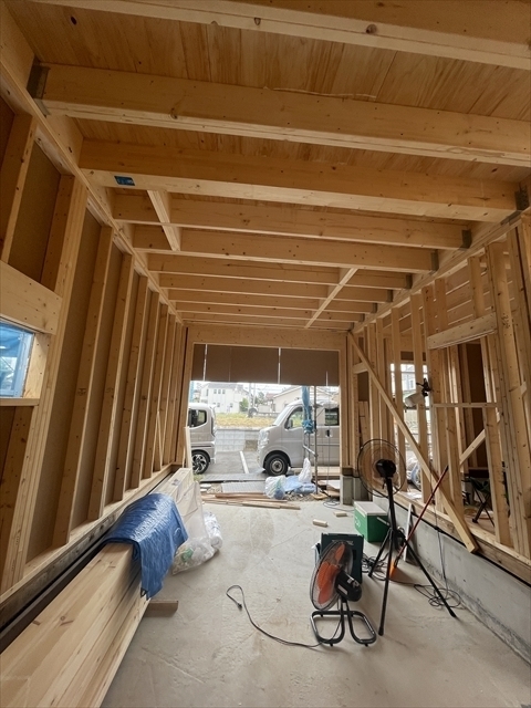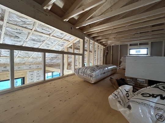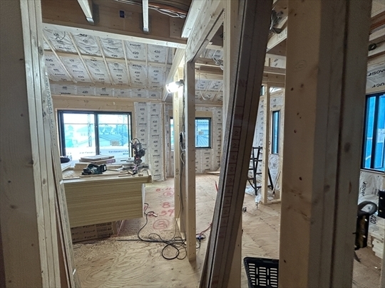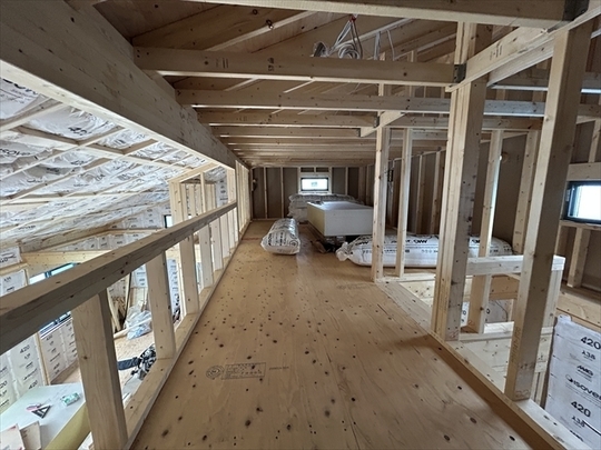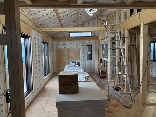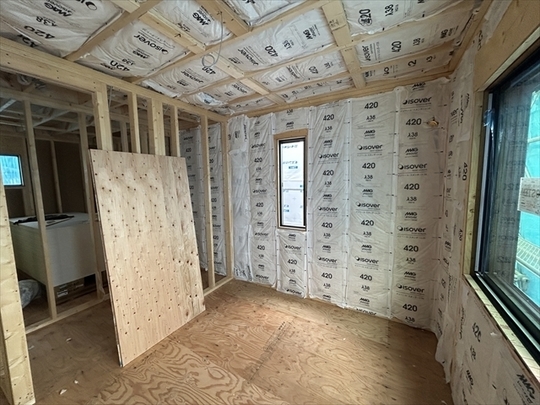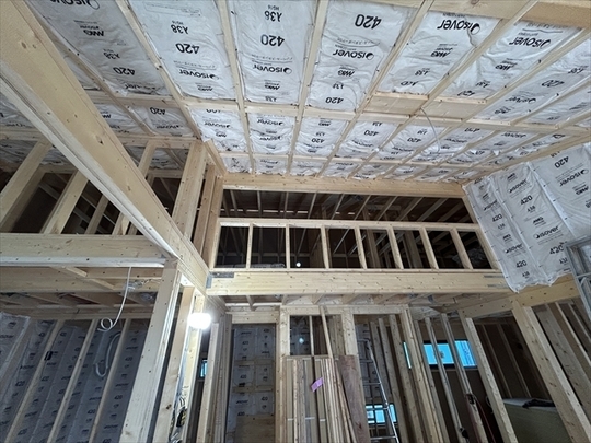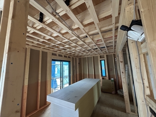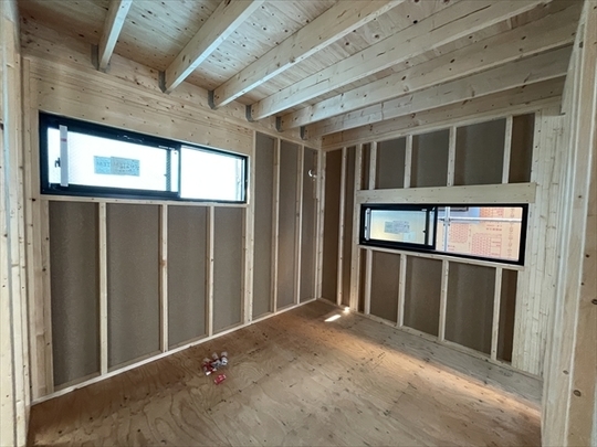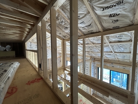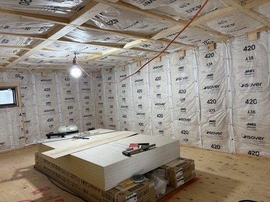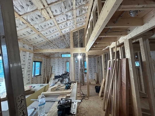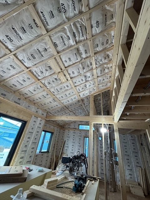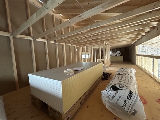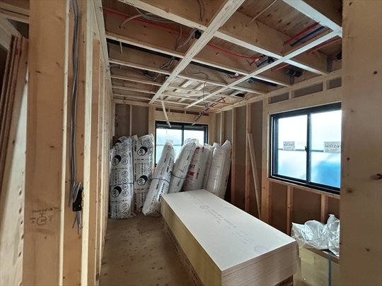 左の棟の断熱材を充填しています。石膏ボードが搬入されています。