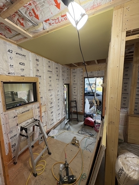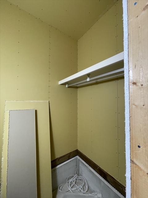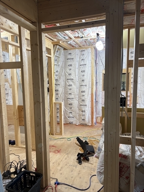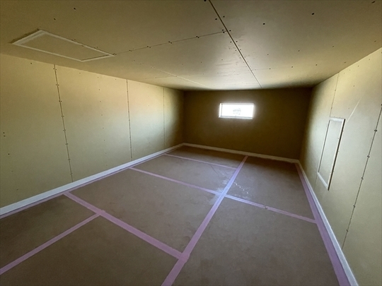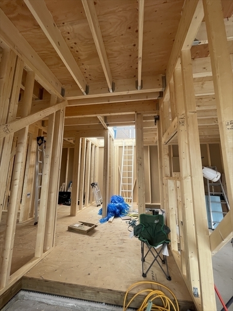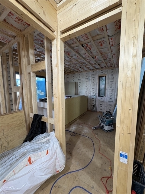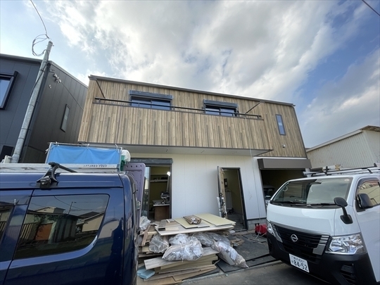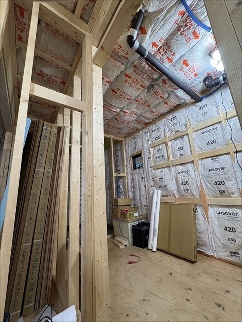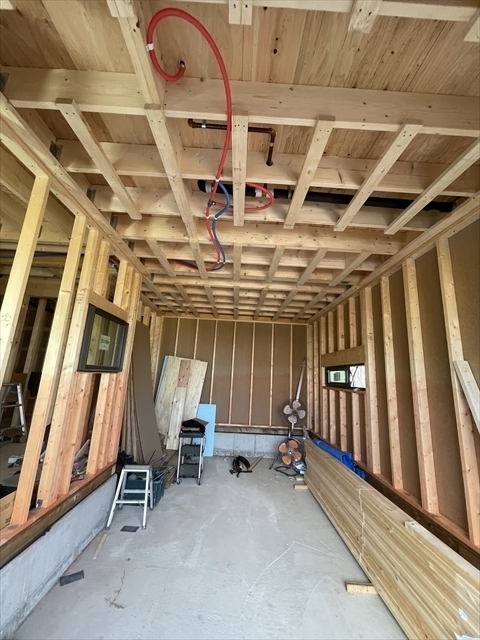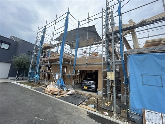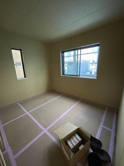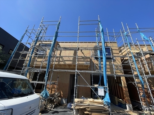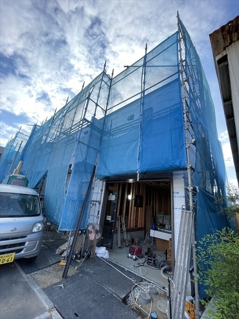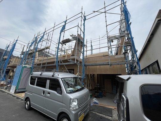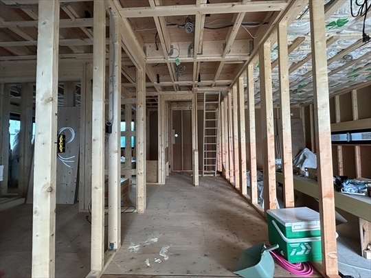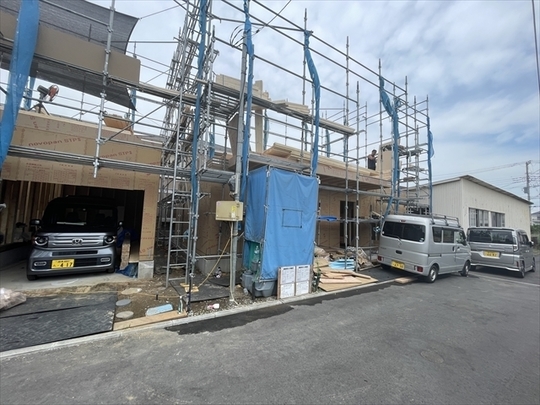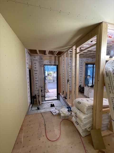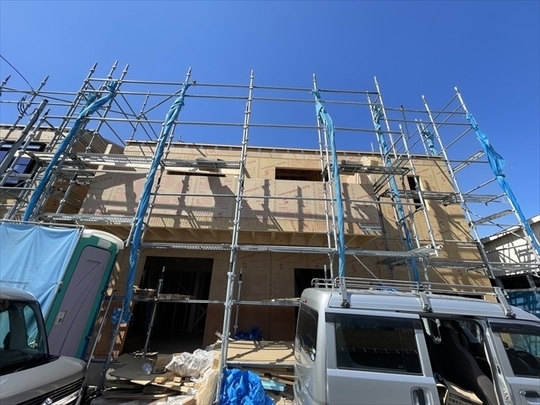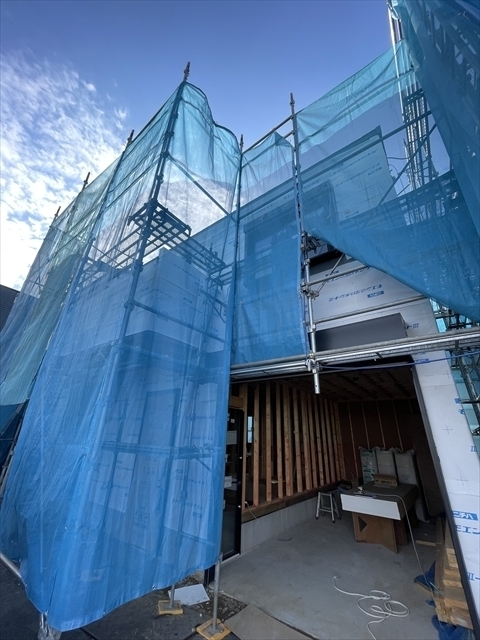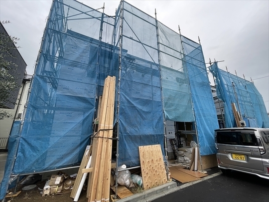 左の棟の断熱材を充填しています。石膏ボードが搬入されています。