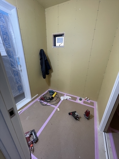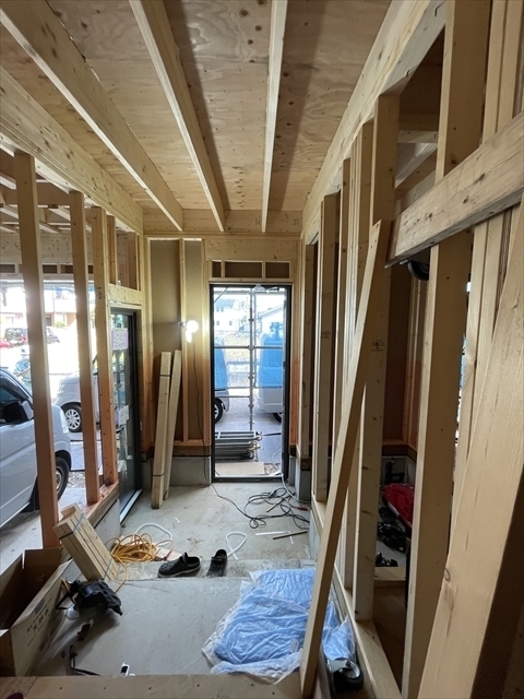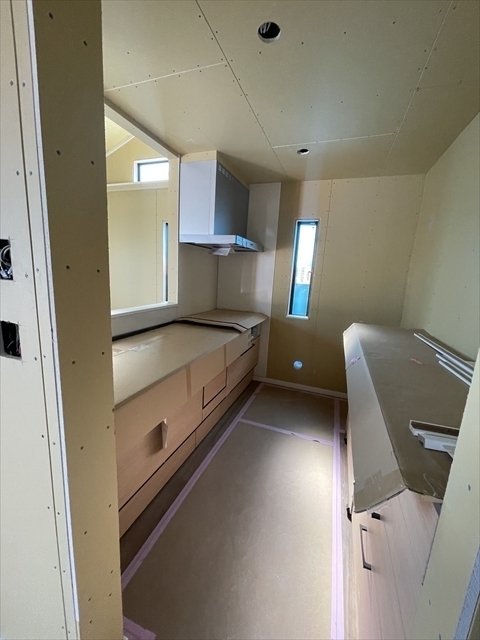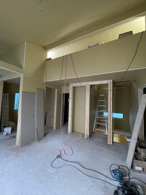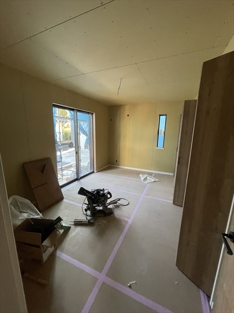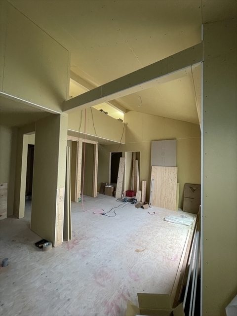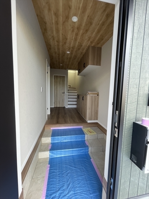 左の棟の石膏ボードが張り終わりました。フローリングを貼り、造作材や玄関収納を取り付けています。