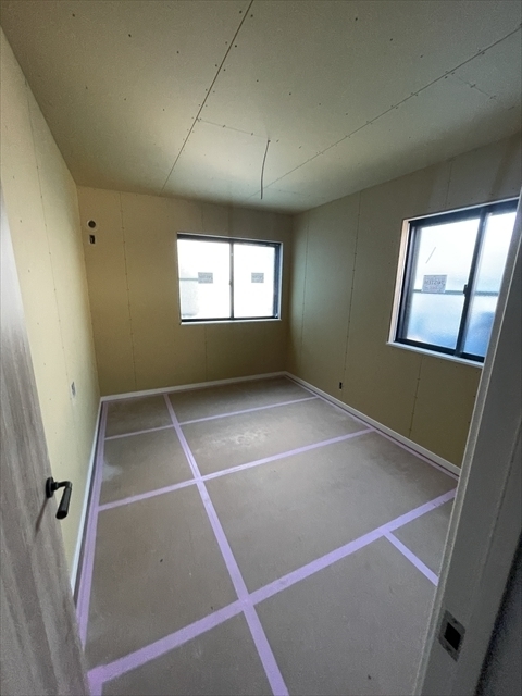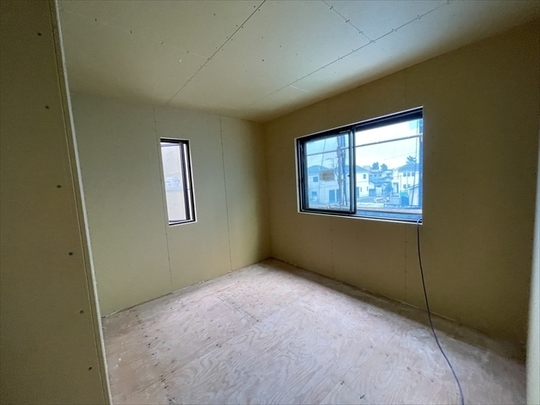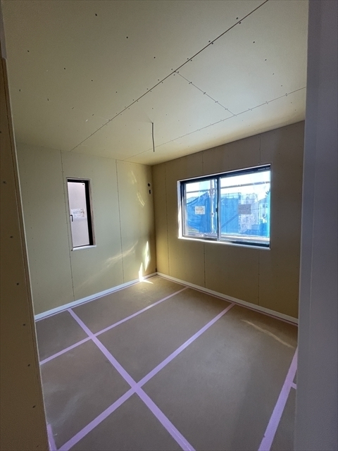 右の棟の石膏ボードを張っています。