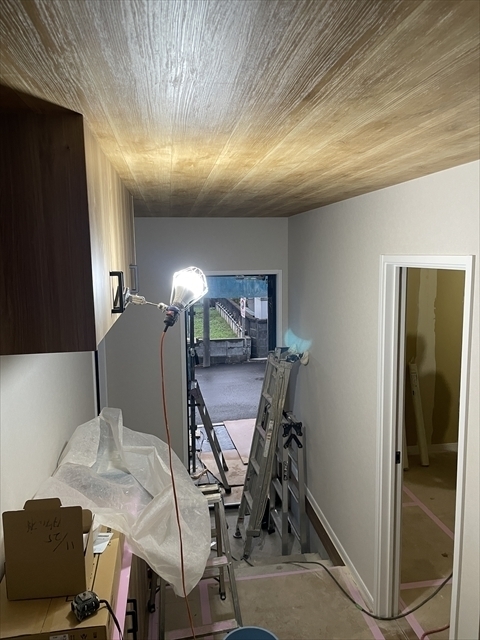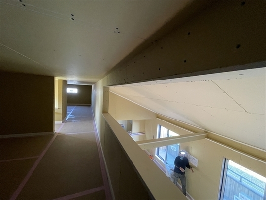 左の棟の石膏ボードを張り進めています。