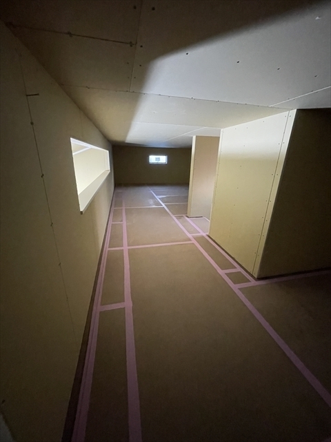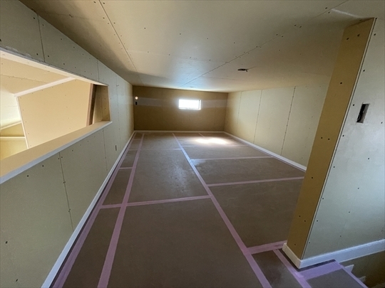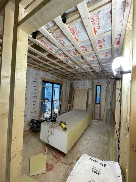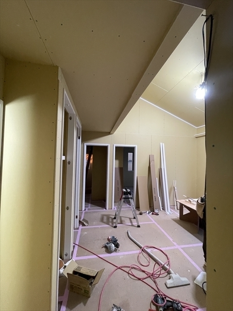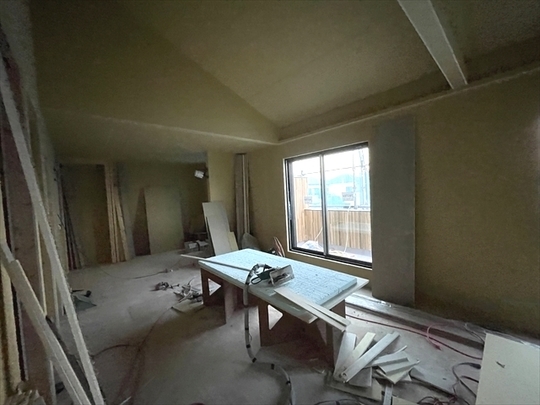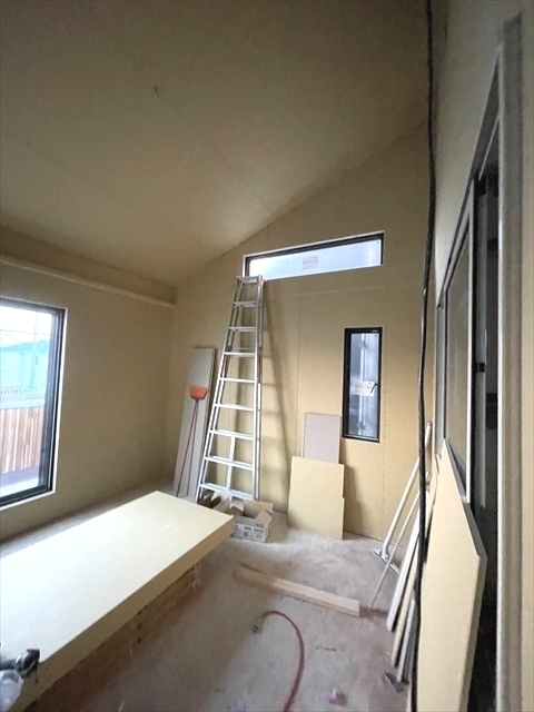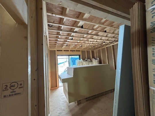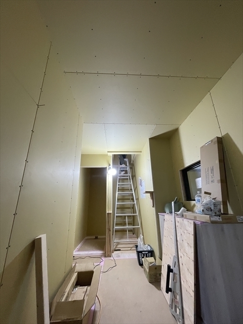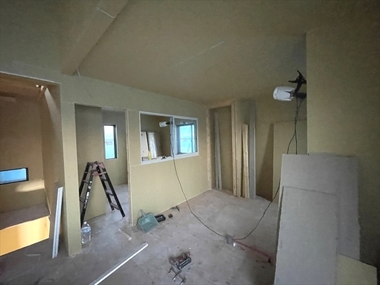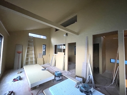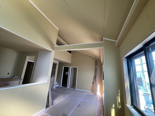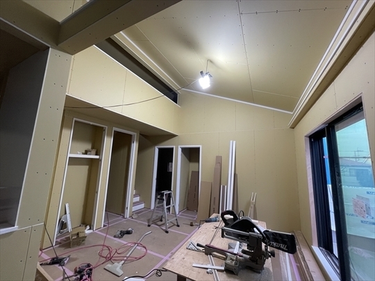 左の棟の造作工事が終了しました。右の棟の断熱材を充填し、石膏ボードを張り始めました。
