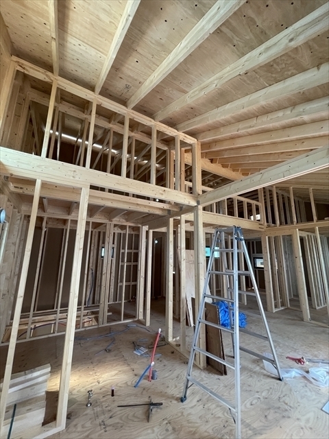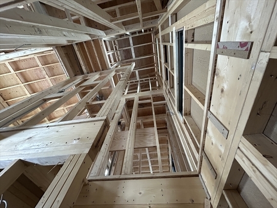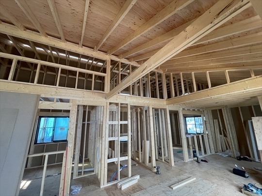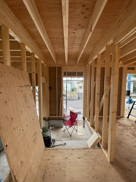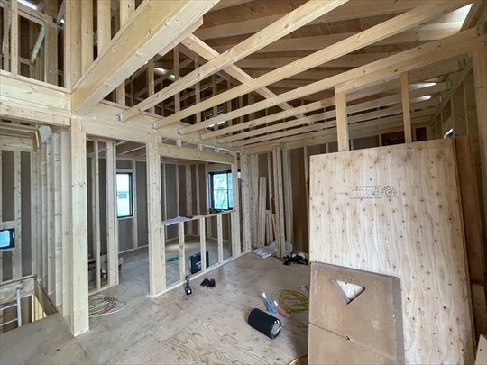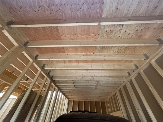 1階の壁が組み終わり、2階の床組を始めています。