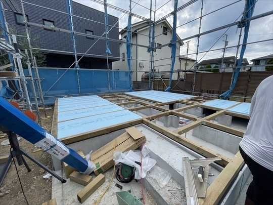 木工事を開始しました。土台と大引の設置を行い、断熱材を充填しています。