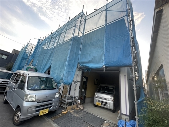 左の棟の内装仕上工事が終了しました。外部は、2棟共に足場が撤去されています。