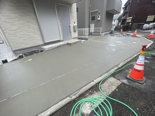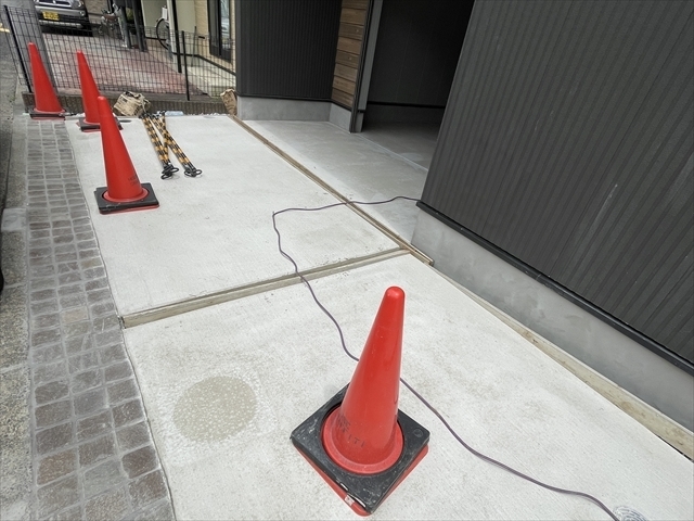 外構工事を開始しました。コンクリートブロックを設置し、フェンスを取り付けし...