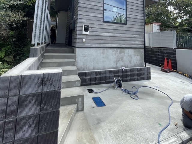 コンクリートブロックを積み、外階段を施工しています。