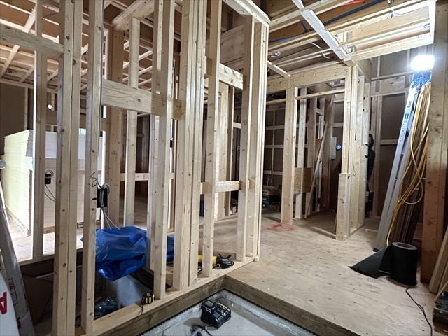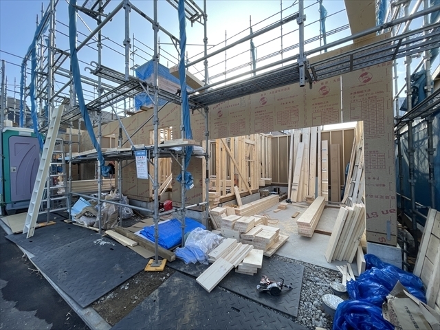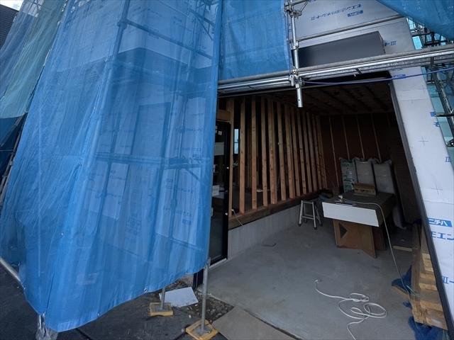 左の棟の断熱材を充填しています。石膏ボードが搬入されています。