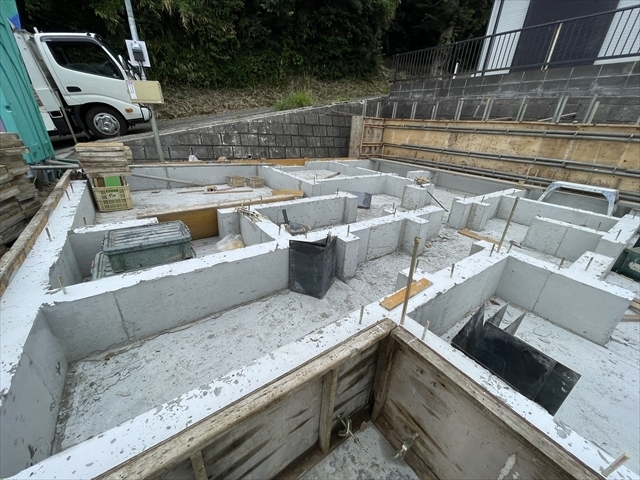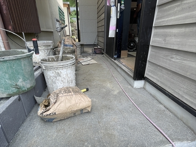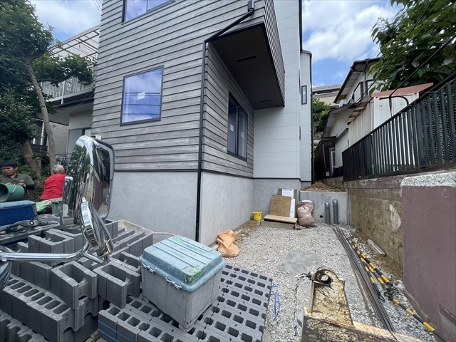 外構工事を開始しました。コンクリートブロックを搬入しています。屋内のタイル...