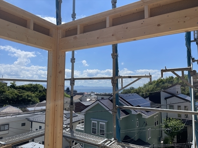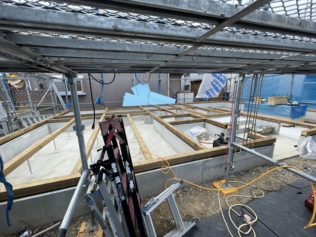 1階の壁が組み終わり、2階の床組を始めています。