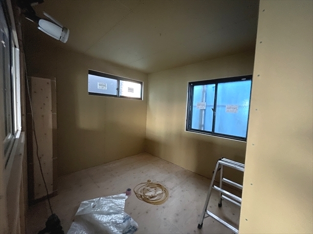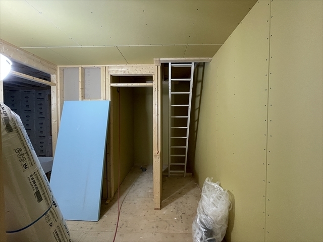 断熱材を充填し、石膏ボードを張り進めています。