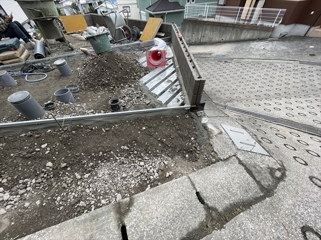 外構工事を開始しました。コンクリートブロックを積んでいます。