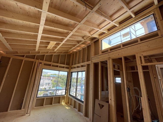 木工事が終了しました。サッシの取り付けを行っています。